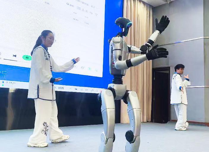 随后,湖北中医药大学药学院瞿领航副磨真金不怕火带学生们晓悟东说念主形机器东说念主打太极的魔力。跟着音乐响起,舞台上出现了三个身穿练功服的学生,与他们一同登台的,还有一位非常的“嘉宾”——一个憨态可掬的机器东说念主。在同学们的欣喜声中,机器东说念主与三位同学一说念,逐渐打起了太极拳。一招一式,虽显稚嫩,却刚柔并济,传统技击与当代科技的完整交融,获得了阵阵掌声。