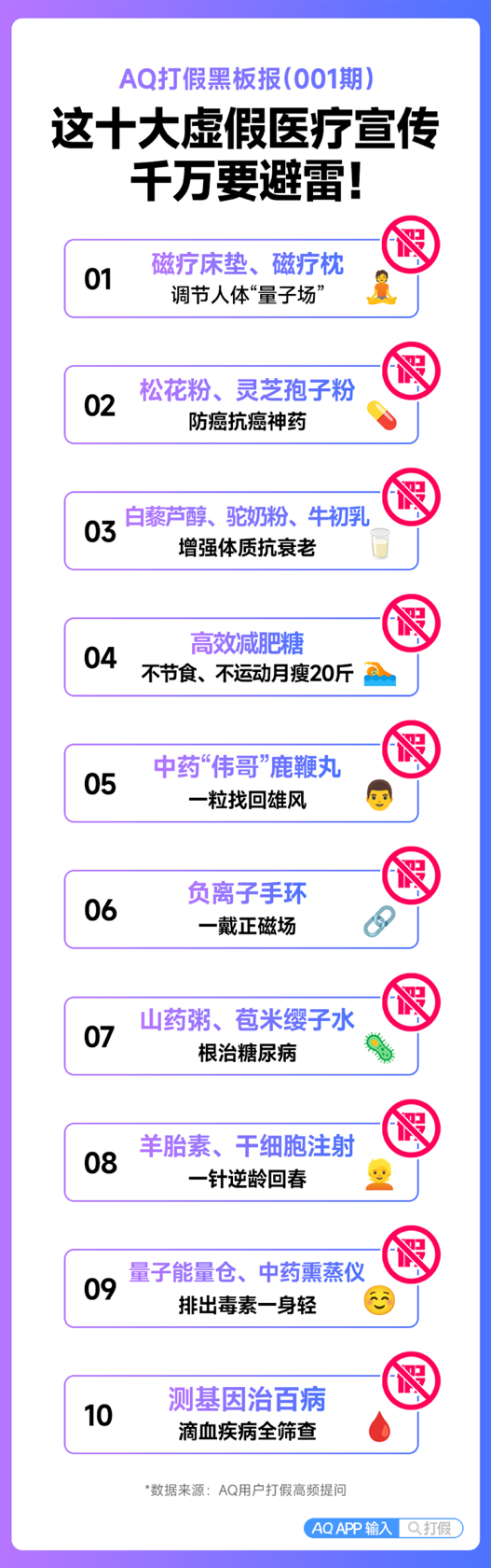 继向假医疗告白讲和后,8月20日,AI健康愚弄AQ发布首期《打假黑板报》,把柄打假辟谣专区用户发问热度,给出十大最热异常医疗告白宣传骗局。磁疗床垫、灵芝孢子粉、白藜芦醇、驼奶粉、减肥糖、羊胎素打针、量子能量仓等糊口中常见的保健品、养生仪器等家具上榜。